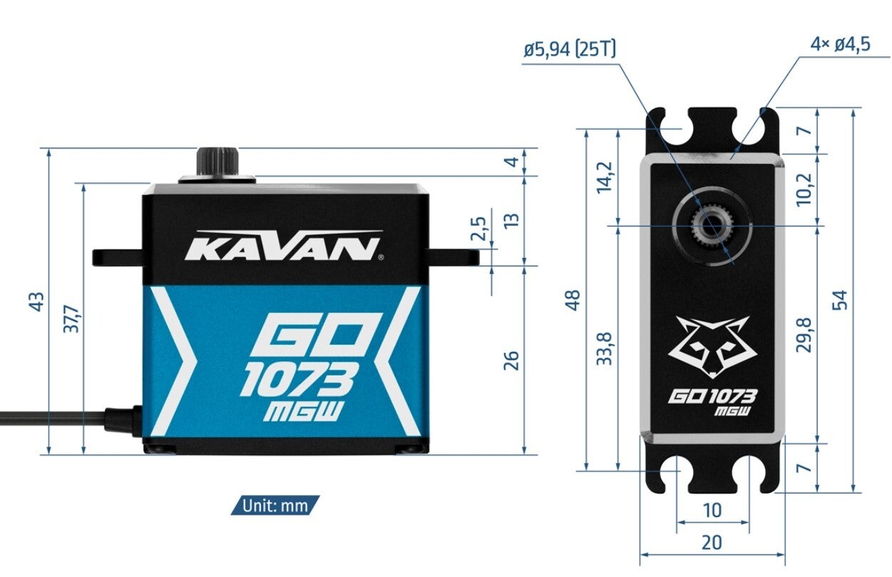 De Kavan GO-1073MGW is een hoogwaardige, waterdichte digitale servo met een indrukwekkend koppel- en snelheidsbereik en programmeerbare instellingen die kunnen worden aangepast voor specifieke toepassingen. Deze duurzame servo van 73g is uitgerust met een coreless motor, magnetische encoder en geharde stalen tandwielen, wat zorgt voor precisie en duurzaamheid onder zware belasting. De aluminium behuizing met IP67-classificatie biedt uitstekende koeling en betrouwbare bescherming tegen stof en water, wat deze servo ideaal maakt voor grote RC-vliegtuigen, 1:8–1:10 RC-auto's en boten.
